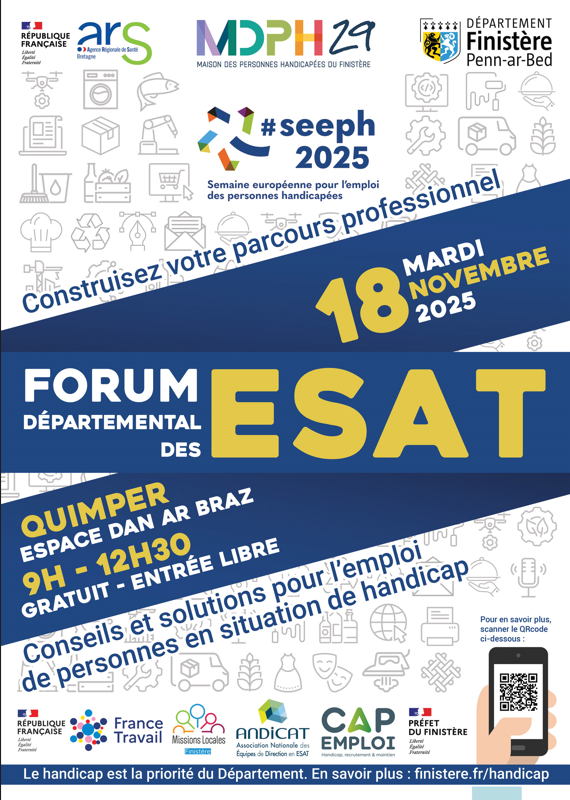 Dans le cadre du plan départemental Handicap (Pacte de Pleyben) et de la semaine européenne pour l’emploi des personnes en situation de handicap, la MDPH et le Conseil départemental organisent en partenariat avec l’ARS, la DDETS, les ESAT du Finistère et le réseau pour l’emploi un « forum des ESAT ».